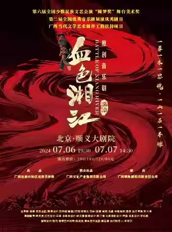 音乐剧《血色湘江》取材于1934年11月发生在广西桂北湘江战役的史实,艺术地讲述了在湘江战役中执行后卫任务的部队掩护中央机关和兄弟部队强渡湘江,最终全部壮烈栖牲的感人故事。在这场血与火的考验中,革命英烈以对党和革命事业的无限忠诚,以勇于胜利,勇于突破、勇于牺牲的精神力量,以巨大的牺性为代价成功突破军事重围,杀出了一条走向新生、走向胜利的革命道路。该剧有机结合了歌剧的庄重大气、话剧的严肃内敛、舞剧的激情张场等特点,力求以宏大的主题立意、现代的舞美技巧和深刻的精神感悟,在舞台上高擎理想火炬,传承红色基因,让主旋律文艺精品在新时代焕发光亮。